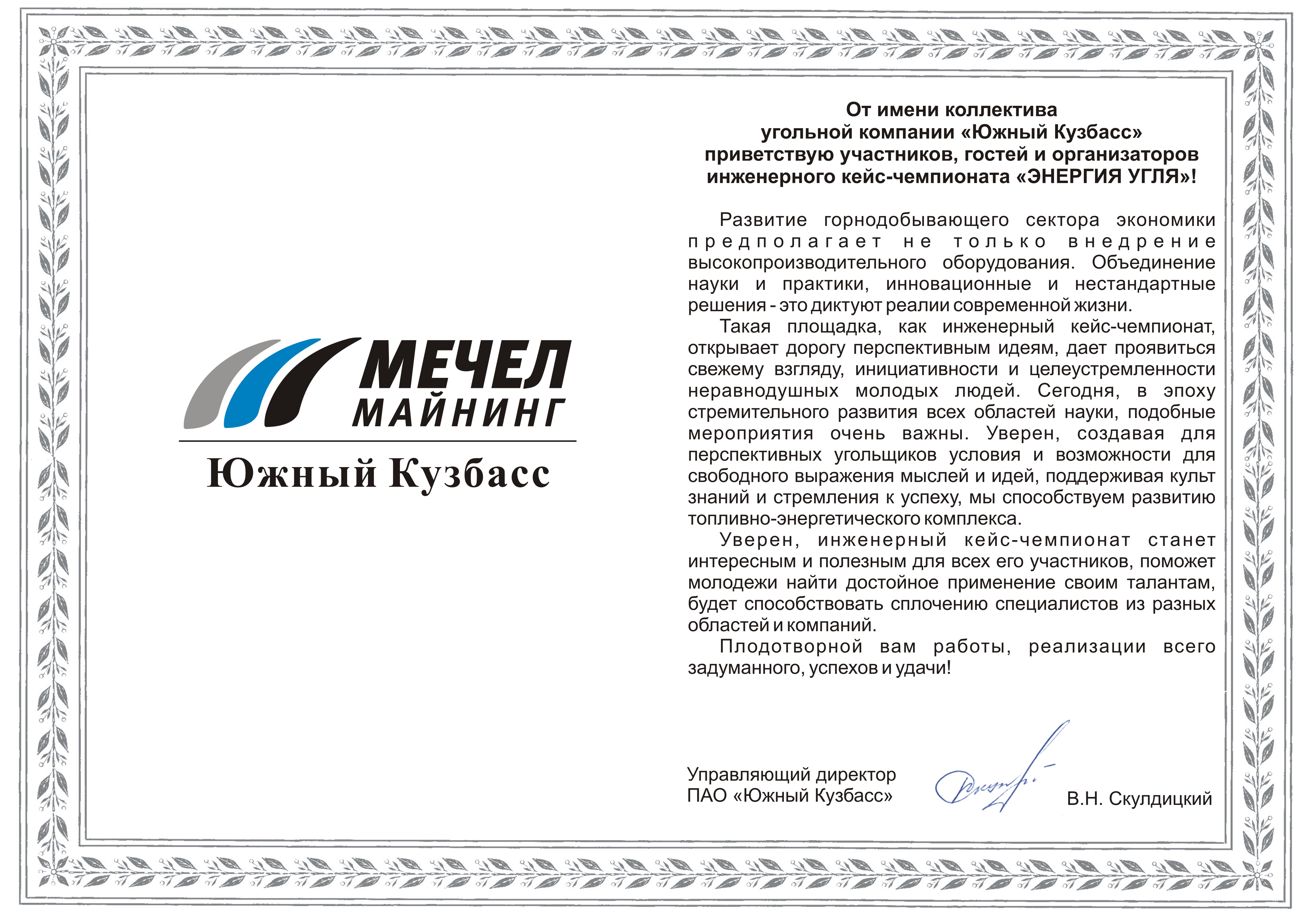 Угольная компания "Южный Кузбасс", входящая в структуру одной из ведущих мировых компаний в горнодобывающей и металлургической отраслях - ПАО «Мечел», направило приветственное слово участникам, гостям и организатором инженерного кейс-чемпионата «ЭНЕРГИЯ УГЛЯ 2018».